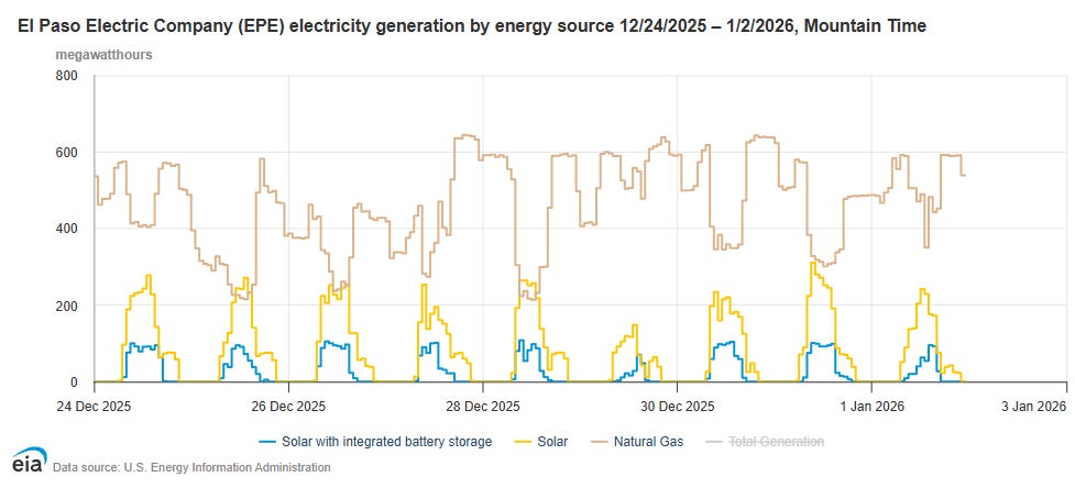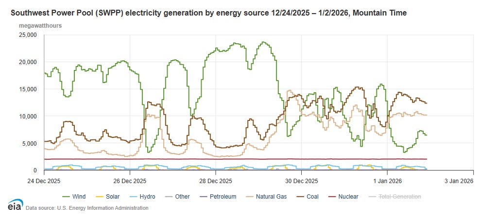 The graph below shows PNM’s fluctuations over nine days in generation types, and battery charging and discharging. The afternoon of NYE, the wind wasn’t even at peak capacity.