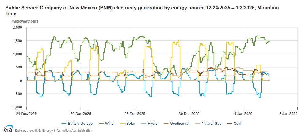 While servicing two-thirds of the state’s population, PNM meets demand with large amounts of wind, solar, and batteries. PNM’s ‘Real Time Renewable Energy %’ said that 95% of PNM’s generation mix was renewable on the afternoon of New Years Eve.