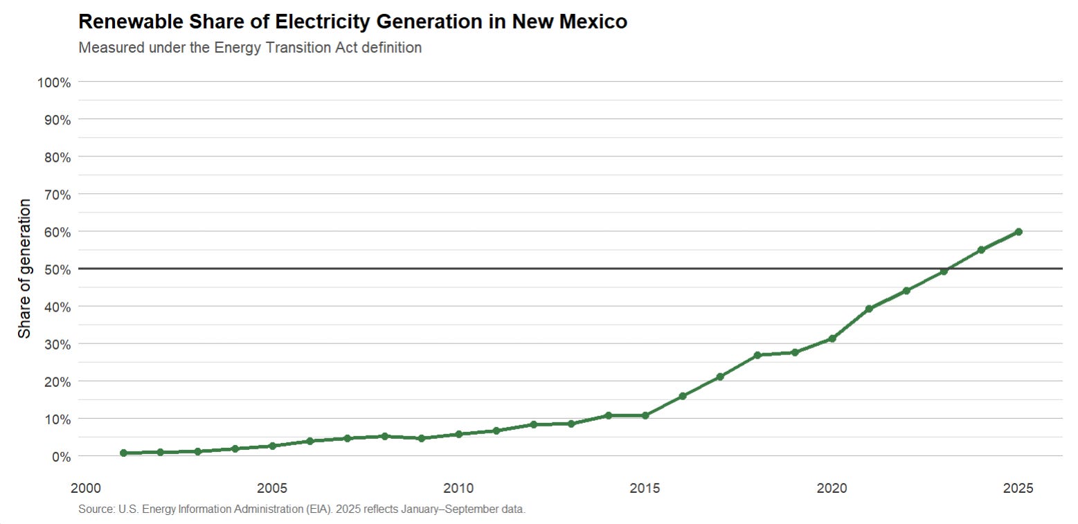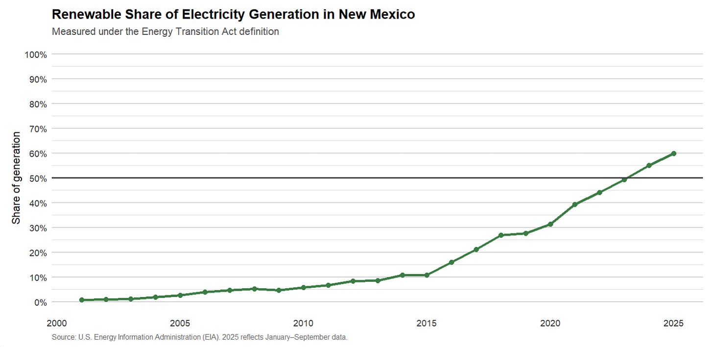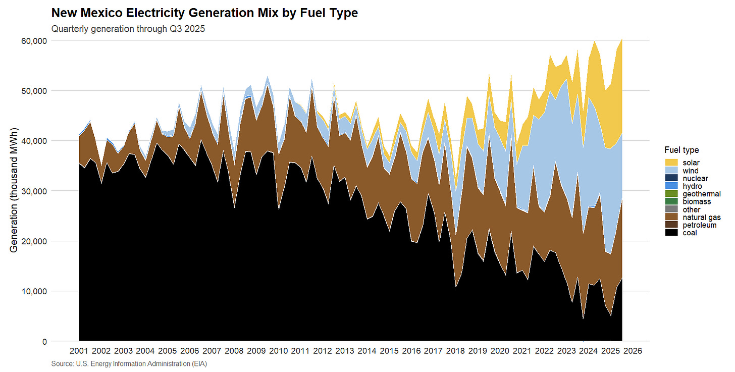 In 2001, New Mexico had with one of the dirtiest electricity grids in the US, with just 0.8% of generation coming from renewables. It ranked as the 7th-dirtiest grid by percentage, dominated by coal. Fast forward to today, New Mexico has the 9th-cleanest grid with 59% renewable generation through the first 10 months of 2025. Since 2001, only Vermont has increased renewable generation share more than New Mexico.