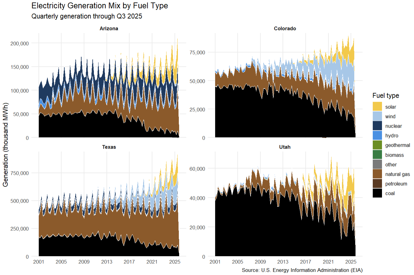 The charts below give hints about how things work in different states. Arizona had the political will to build nuclear back in the 1970s, and still utilizes it. Colorado has a generation mix quite similar to New Mexico. Texas, unsurprisingly, uses a ton of their own natural gas. And Utah has a legacy coal industry that’s slowly giving way to more renewables.