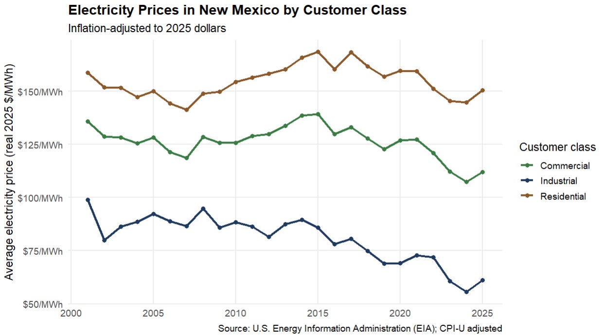 New Mexico’s abundance of energy, renewable or not, and relatively low demand has translated into the cheapest industrial-use electricity in the US, with 5.53 cents/kWh as of October 2025. Across all sectors (residential, industrial, commercial, and transportation), New Mexico has the second cheapest electricity in the nation - second only to North Dakota.